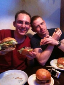 二人ともまさかの両手にバーガー、W食い+余裕の笑み。