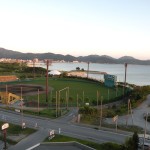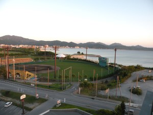 ベランダから見た海と球場 ↓